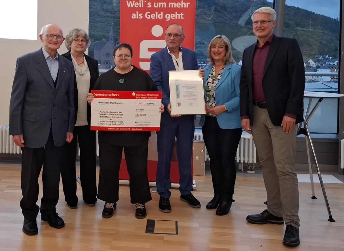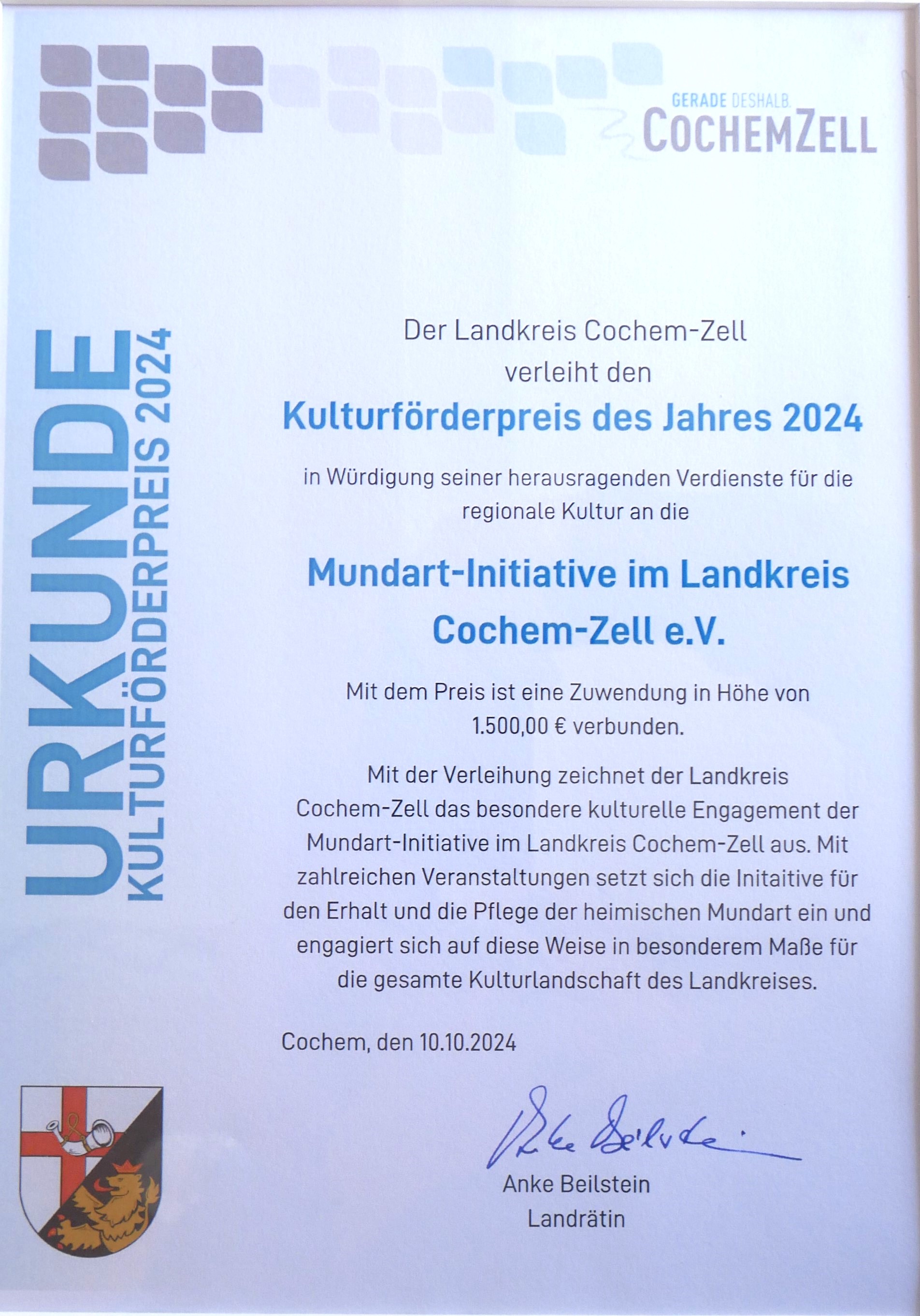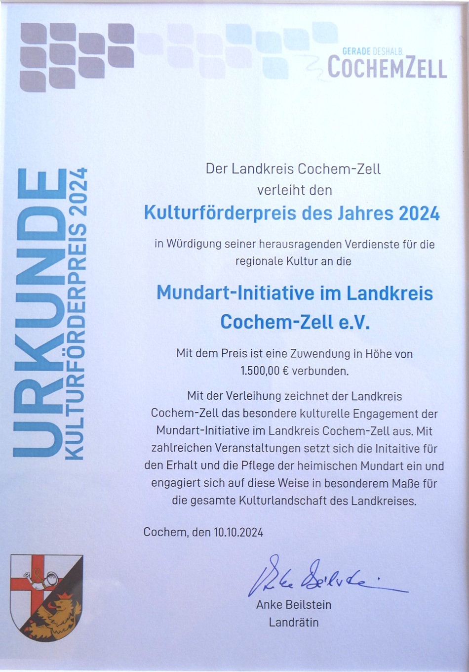 Die Mundart-Initiative hatte sich um den „Kultur-Förderpreis des Kreises Cochem-Zell“ beworben und war mit dieser Bewerbung erfolgreich. Am 10. Oktober wurde der Förderpreis, verbunden mit einer Fördersumme von 1500 € an Mitglieder unseres Vereins im Rahmen einer schönen Feier im Kreishaus verliehen.